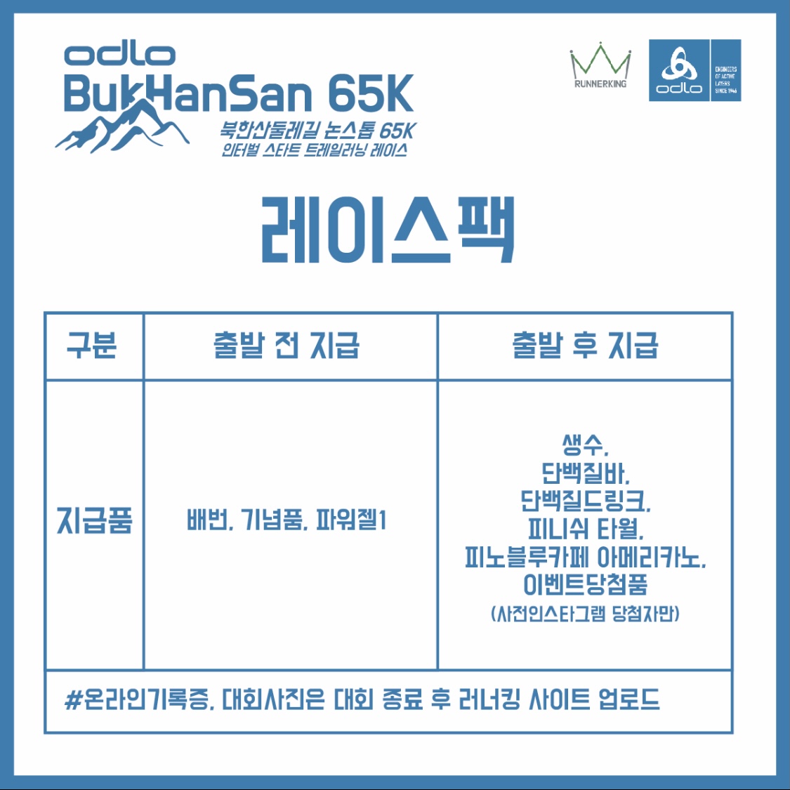 레이스팩 및 이벤트 당첨품은 대회 당일에 지급하오니 자신의 출발시간보다 최소 한시간 전에 도착해서 지급받으시길 권해드립니다.