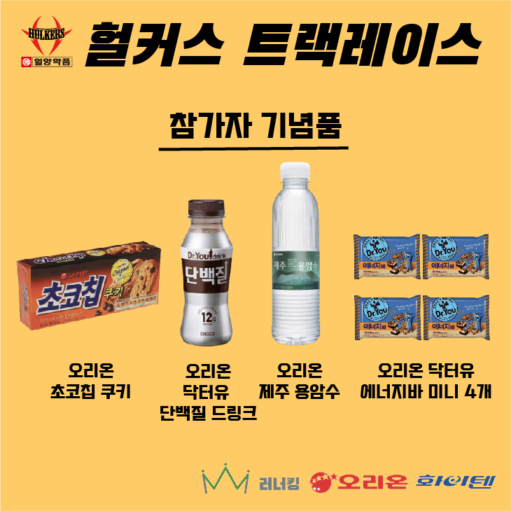 모든참가자에게 오리온제품 초코칩쿠키 단백질드링크 용암수 닥터유미니 제공