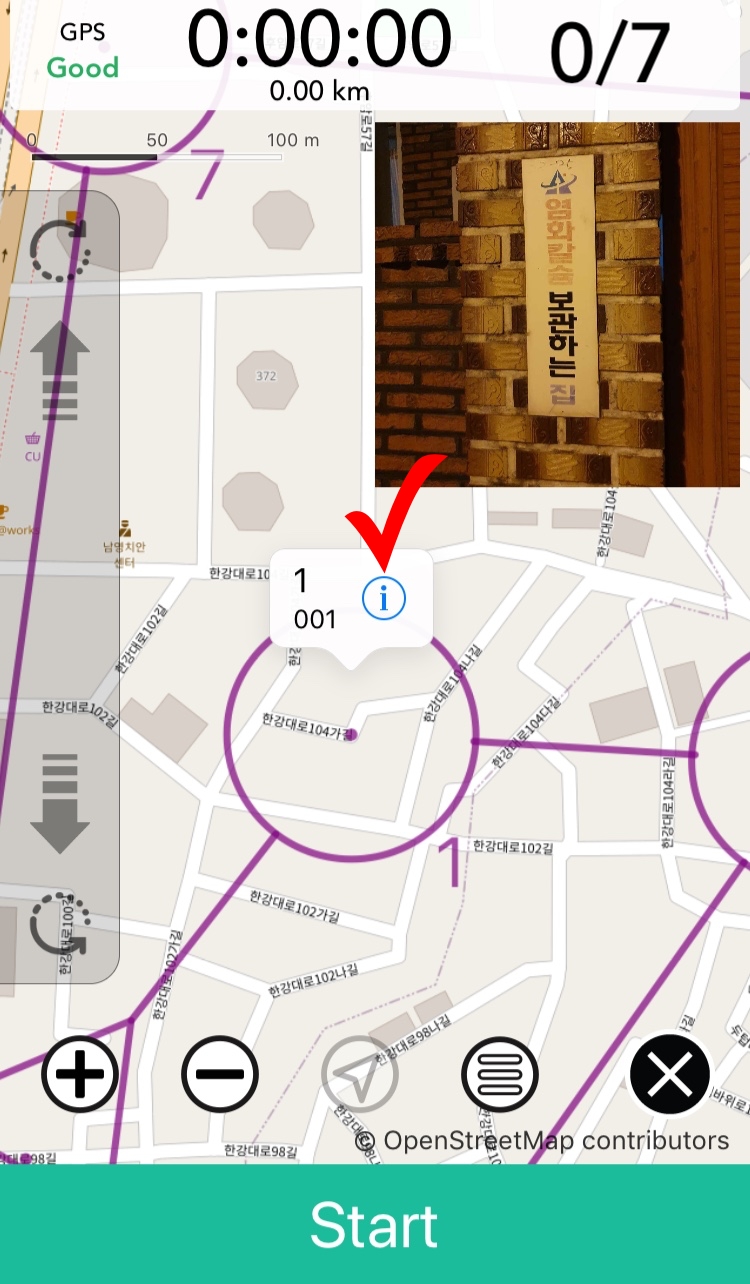 2. 1번 목표물로 이동합니다. 어플에서 i 버튼을 클릭하면 사진을 찍어야할 목표물이 표시됩니다.